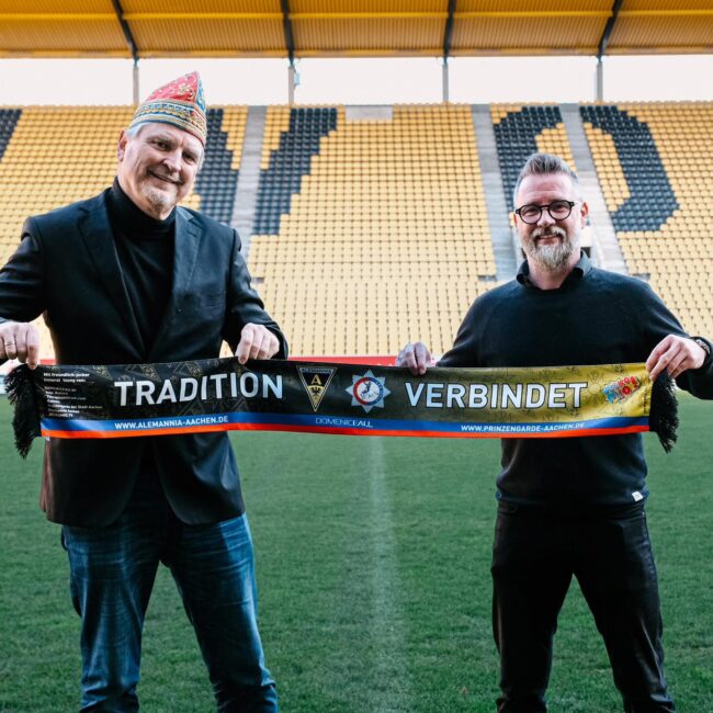 Der Schal, der im Zuge der Kooperation zwischen den beiden Traditionsvereinen Prinzengarde der Stadt Aachen A.R.V. 1910 e.V. und Alemannia Aachen entworfen wurde, ist ab sofort für 11 € im Fanshop am Tivoli erhältlich. Weitere Infos zum Karnevalstrikot, das wie auch der Schal unter dem Sessionsmotto der Prinzengarde 2024 – Tradition verbindet – steht, folgen.