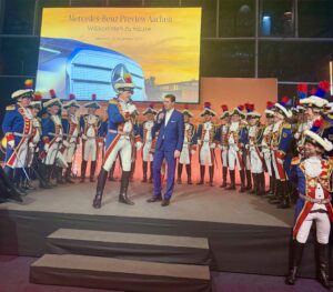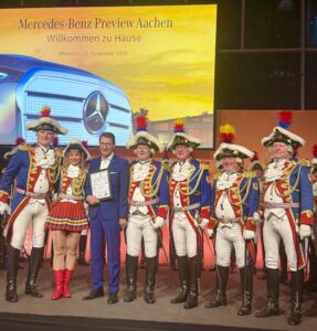 Matthias Hindemith hatte im Jahr 2003 die Mercedes Benz Niederlassung Aachen als Nachfolger von Udo W. Danzer übernommen. Als er seinerzeit nach Aachen kam, hatte er mit dem Karneval bis dato überhaupt noch keine Berührungspunkte. Das änderte sich aber sehr schnell, denn er wurde nur ein Jahr später im Oktober 2004 Senator der Prinzengarde und damit natürlich auch Mitglied unserer Prinzengarde. Wie selbstverständlich engagierte er sich sofort für seine Garde und stellte neben den vier attraktiven Bussen auch noch einen schicken Kommandantenwagen zur Verfügung. Damit führte er die jahrelange Tradition zwischen der Prinzengarde und Mercedes Benz weiter fort, indem die Gardisten weiterhin unter einem „guten Stern“ zu jedem Auftrittsort mühelos gefahren werden konnten.